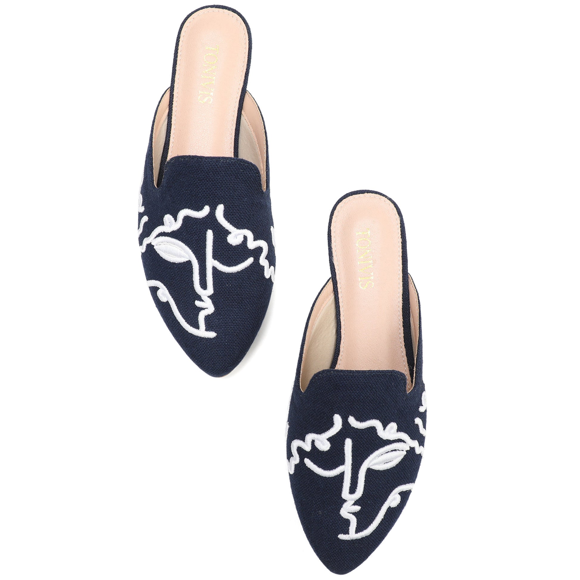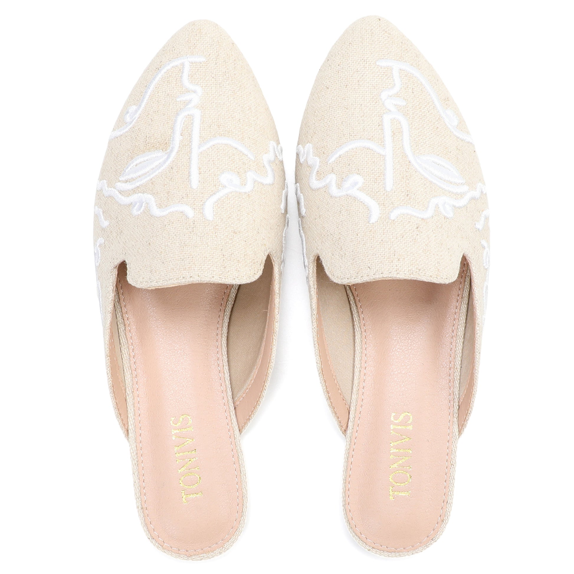 TONIVIS pointed-toe mules blend artistic charm and everyday comfort. Crafted from breathable linen and soft faux-fur fabrics, these slip-on flats feature elegant embroidery and bold animal prints that express individuality and style.
